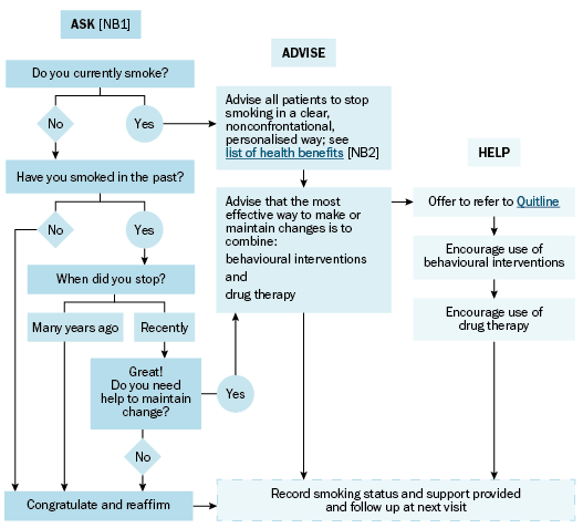 The guiding principles of managing tobacco smoking are ask, advise, help, as outlined by the Royal Australian College of General Practitioners (RACGP) publication Supporting smoking cessation: A guide for health professionals. This approach is summarised in Approach to screening, assessment and interventions for tobacco smoking.
