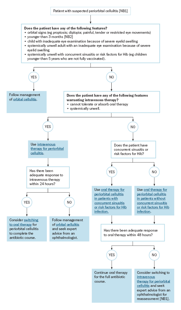 For an algorithm to guide the therapeutic approach for patients with periorbital cellulitis, see Management of periorbital (preseptal) cellulitis.