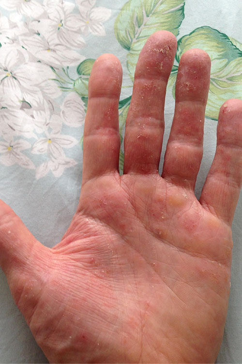 Pompholyx (also called dyshidrotic eczema, vesicular dermatitis, autoeczematisation, or vesicular hand and foot dermatitis) presents as small vesicles (or if severe, as bullae) on the palms, along the fingers, and on the soles. See here for photos of pompholyx. The cause is unclear, but it is associated with atopic dermatitis. Pompholyx can be precipitated by acute inflammatory tinea (eg of the feet) or molluscum contagiosum. Other aggravating factors include overheating, irritants and stress. Exclude scabies infection.