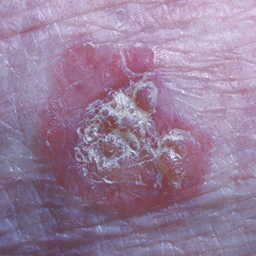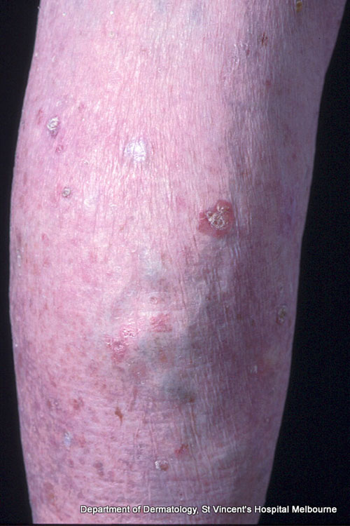 Squamous cell carcinoma (SCC) in situ (also known as intraepidermal carcinoma or Bowen disease) presents as a slowly expanding, well-demarcated, erythematous scaly plaque—it can be mistaken for psoriasis or dermatitis. SCC in situ is usually asymptomatic, but can ulcerate or bleed. It can occur anywhere, but most commonly in sun-exposed areas, especially the lower legs. See here for photos of SCC in situ.