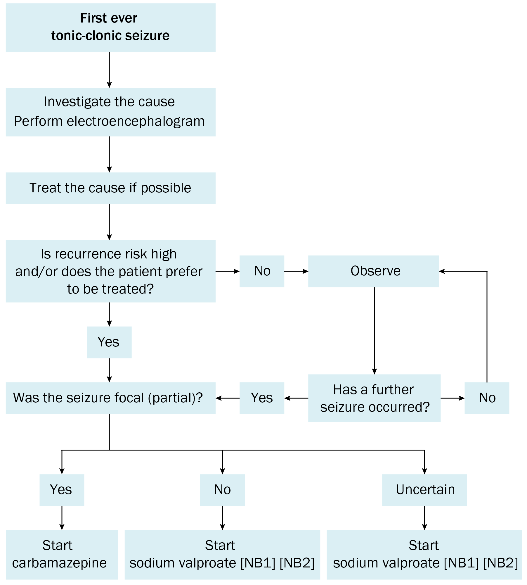 NB1: If possible, avoid sodium valproate in females of childbearing potential; see Planning for pregnancy in patients with epilepsy and Teratogenic and neurodevelopmental effects of antiepileptic drugs. If sodium valproate is the drug of choice, ensure reliable contraception.
